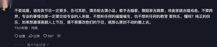 “不要流量,语言类节目一定要多,各司其职,不要跨界,纯正的快乐,不想听任何的催婚催生,也不想听任何的教育。”