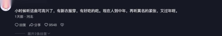 这种感受,在另一条评论里得到了延续。有人说,小时候听到过年的音乐,是纯粹的喜悦,因为有新衣服和好吃的;人到中年再听,却莫名紧张,心里只剩一句感慨:“又过年了呀。”